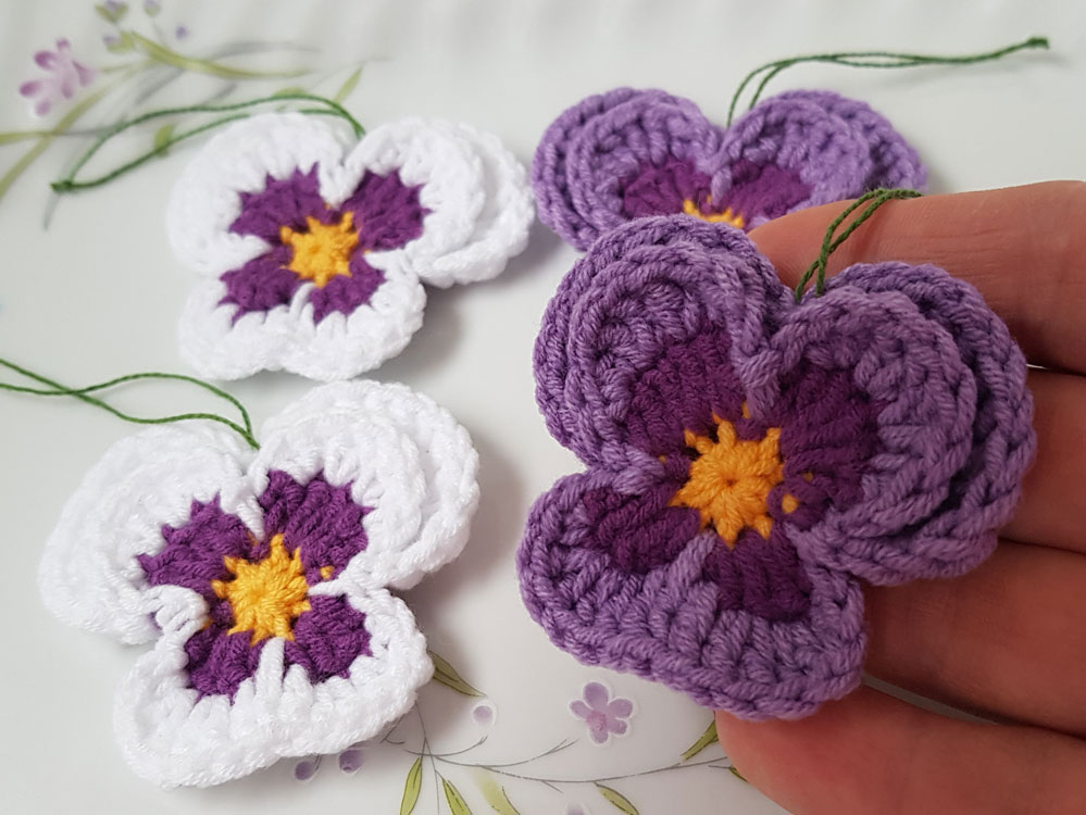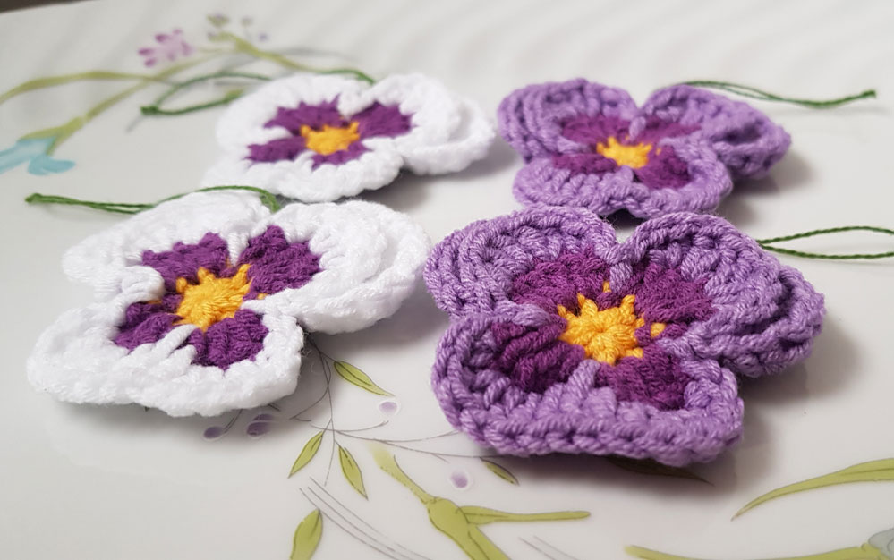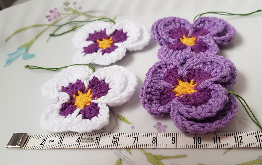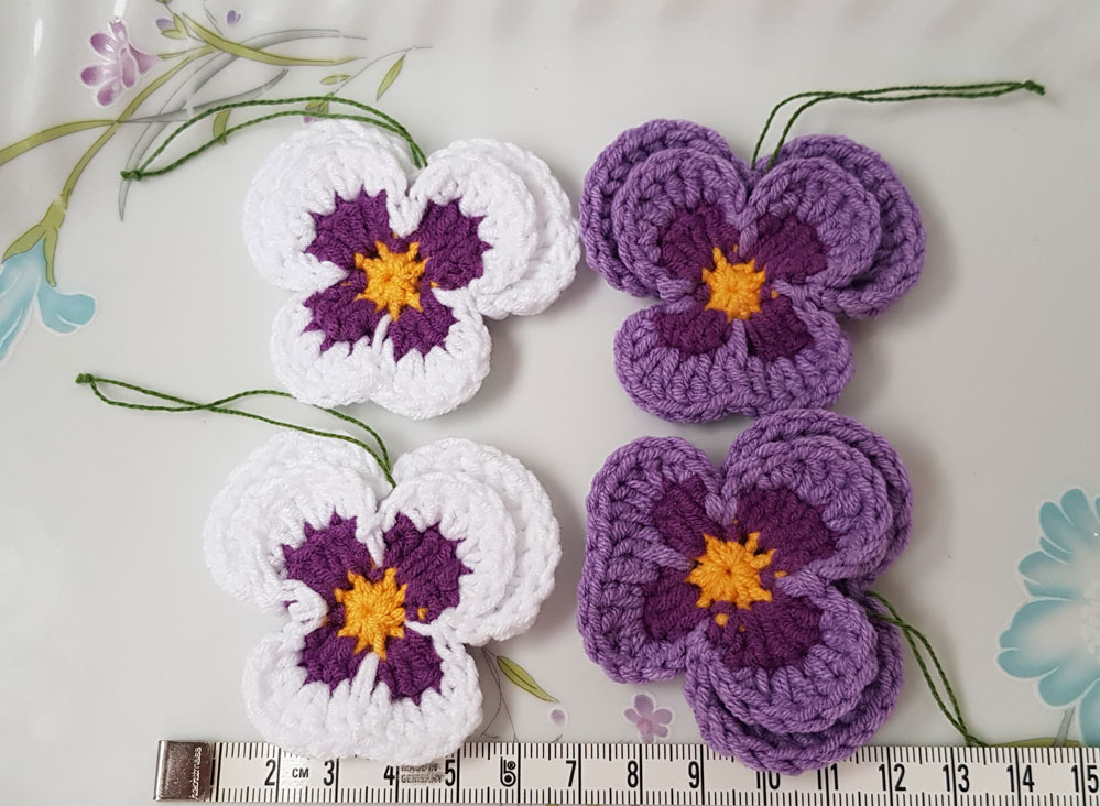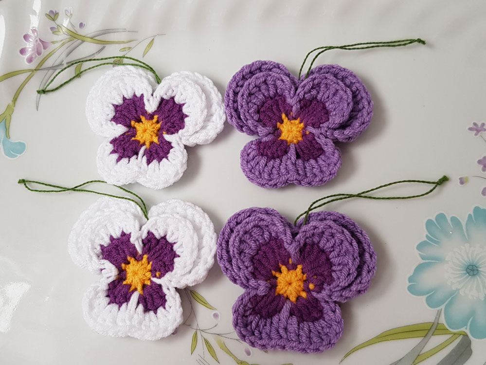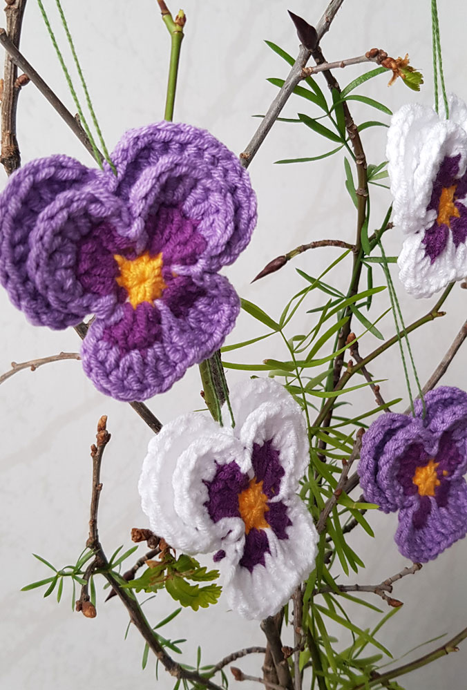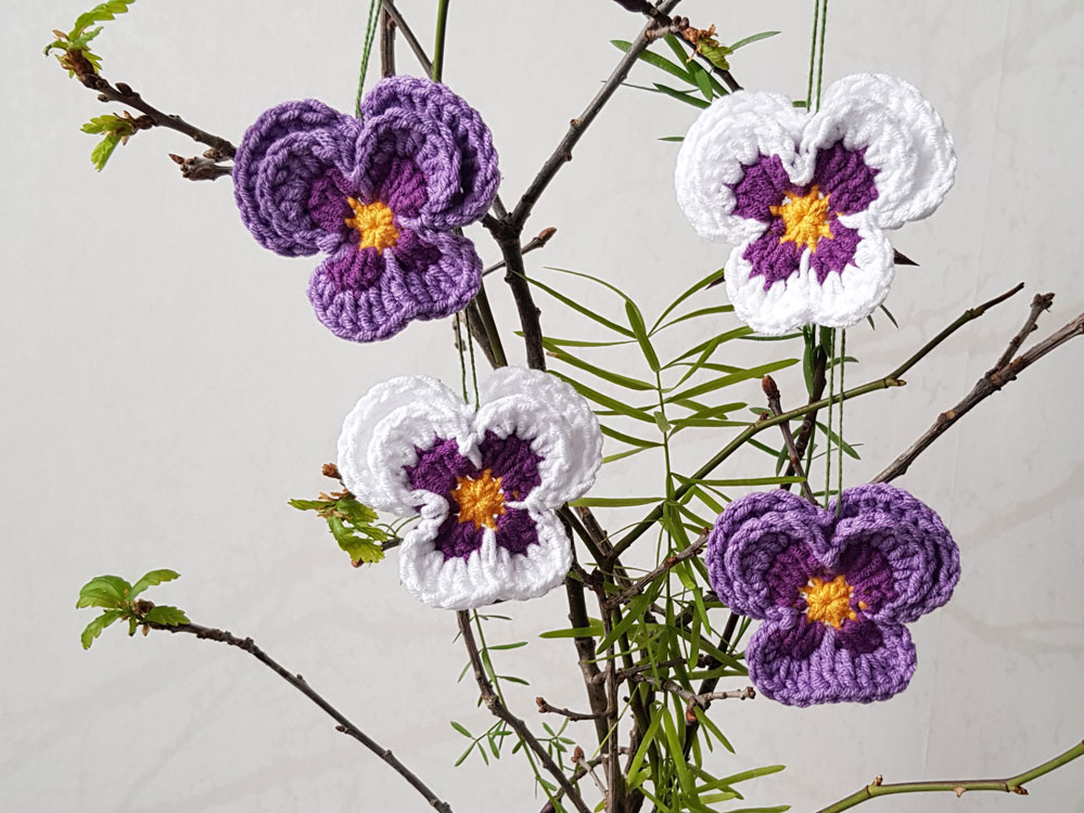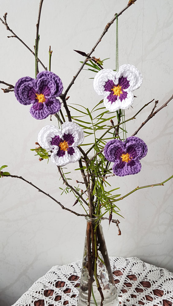 4 nya handvirkade penséer / violer att hänga i påskriset,
