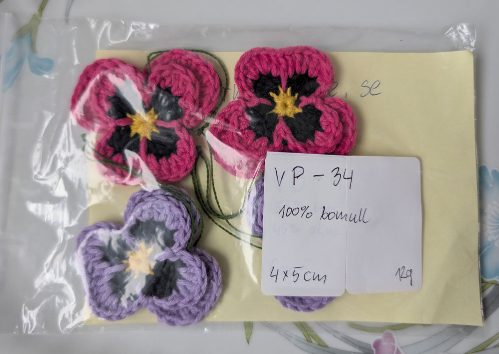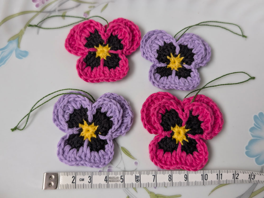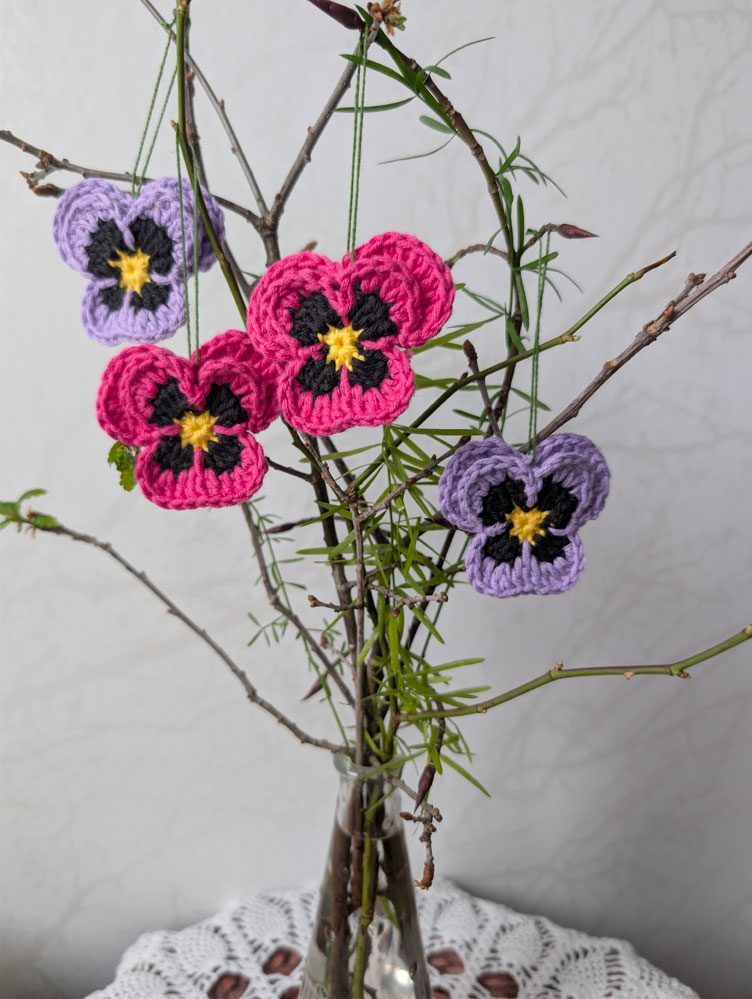 4 nya handvirkade penséer / violer att hänga i påskriset,