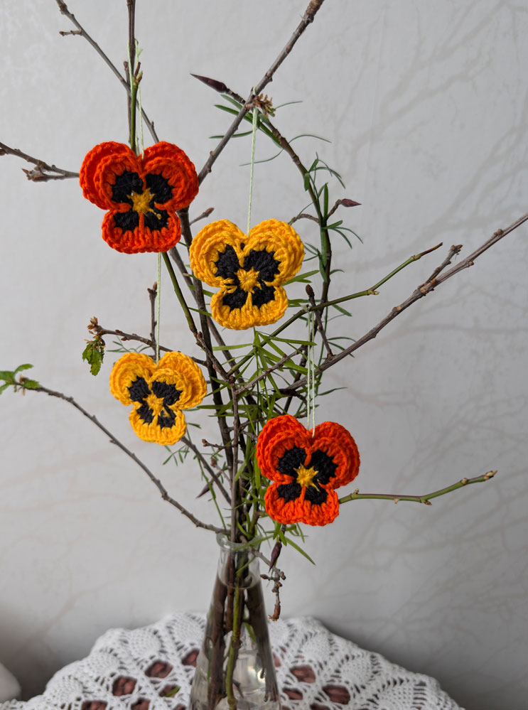 4 nya handvirkade penséer / violer att hänga i påskriset,