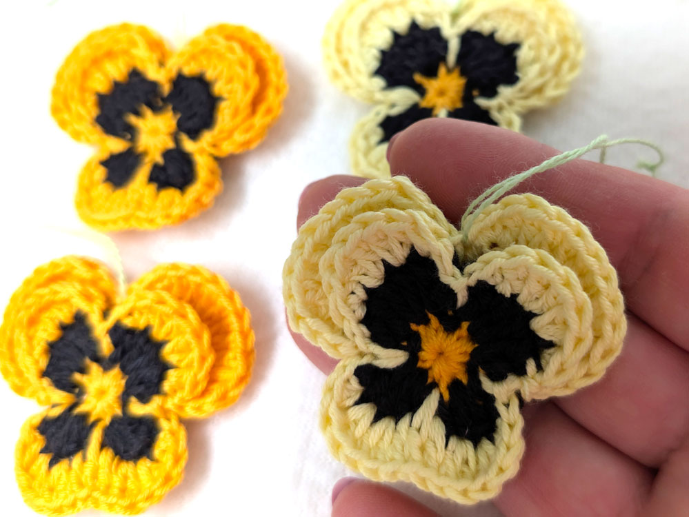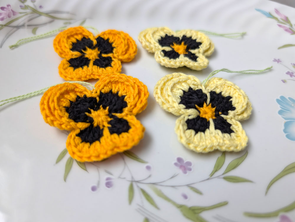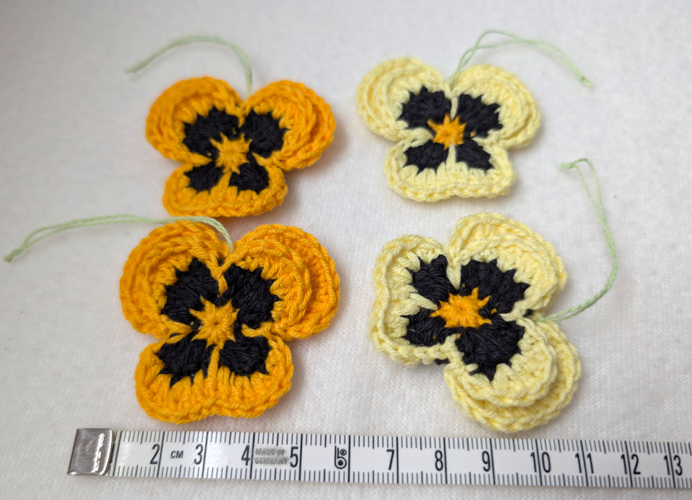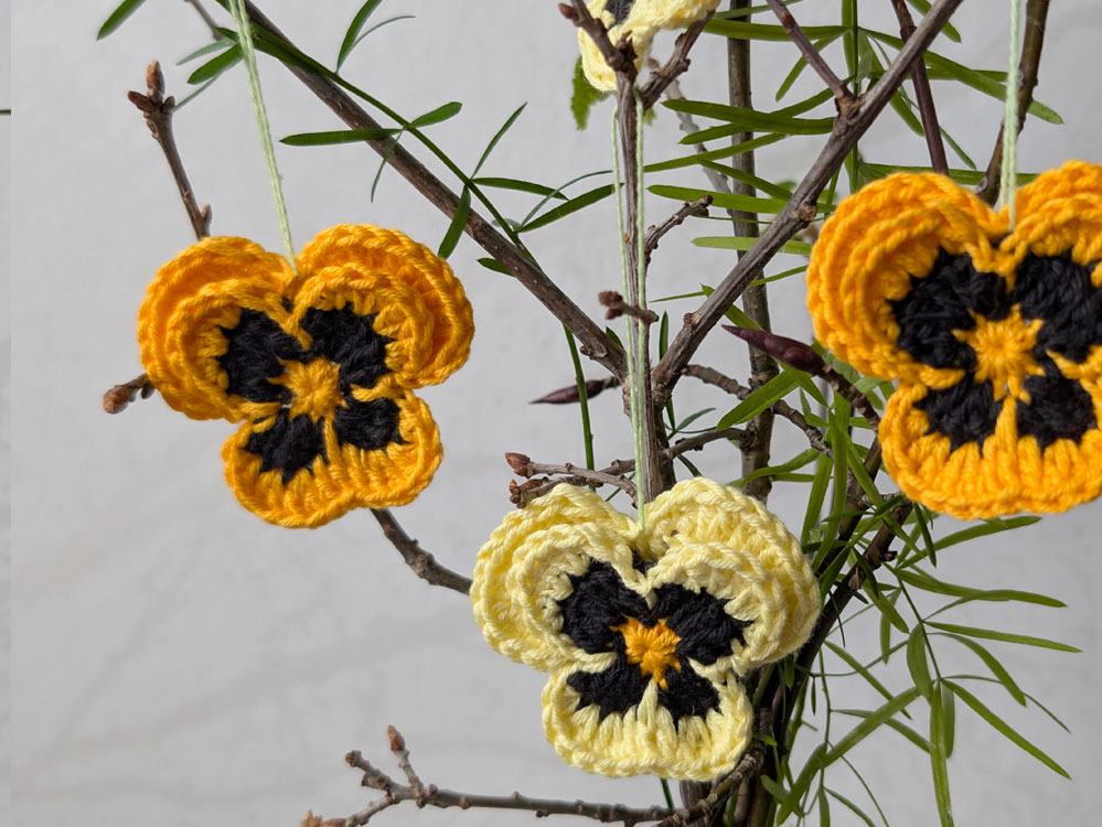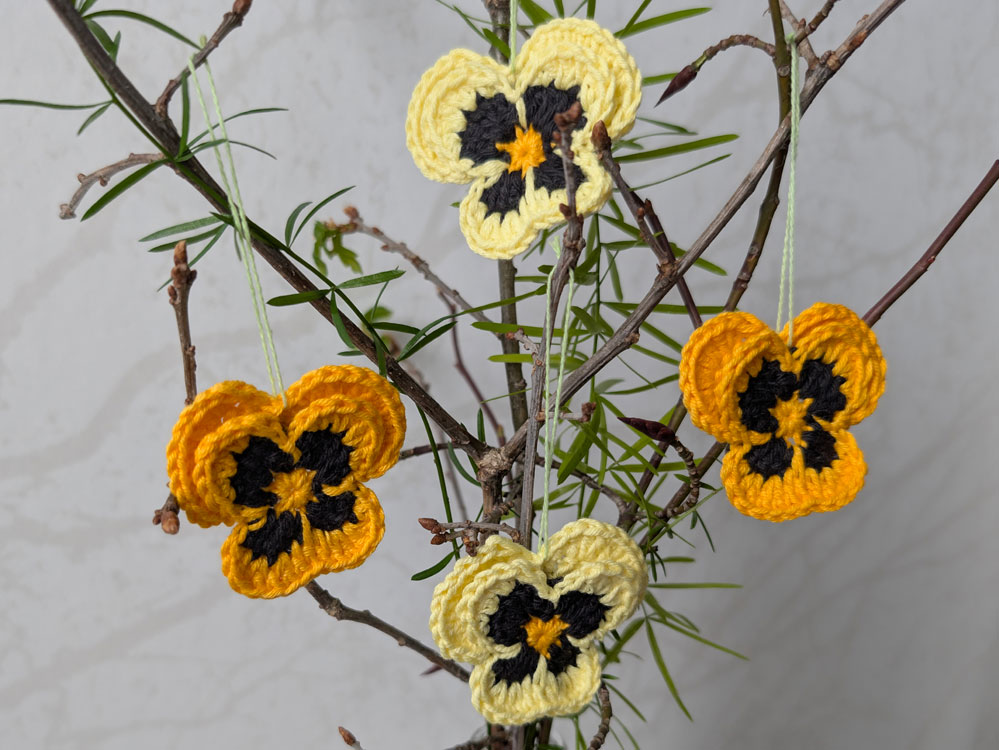 4 nya handvirkade penséer / violer att hänga i påskriset,