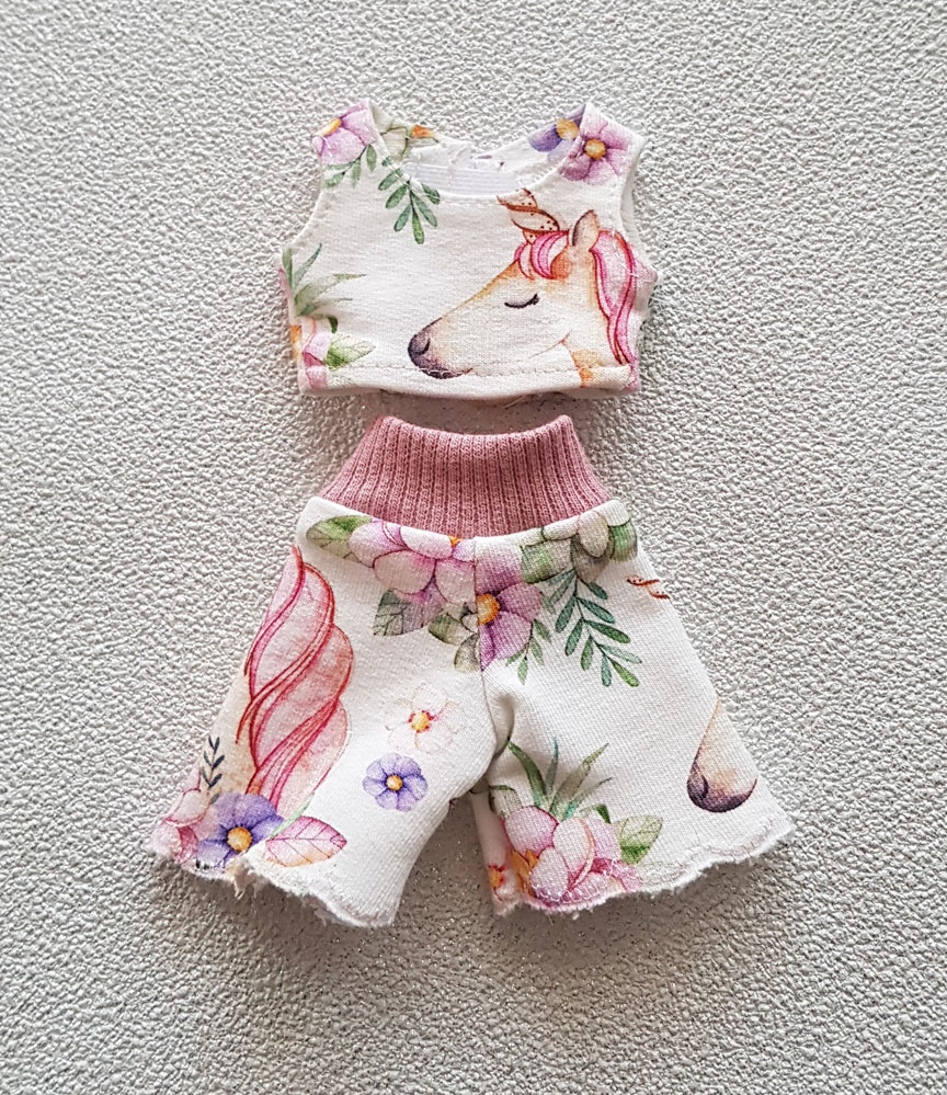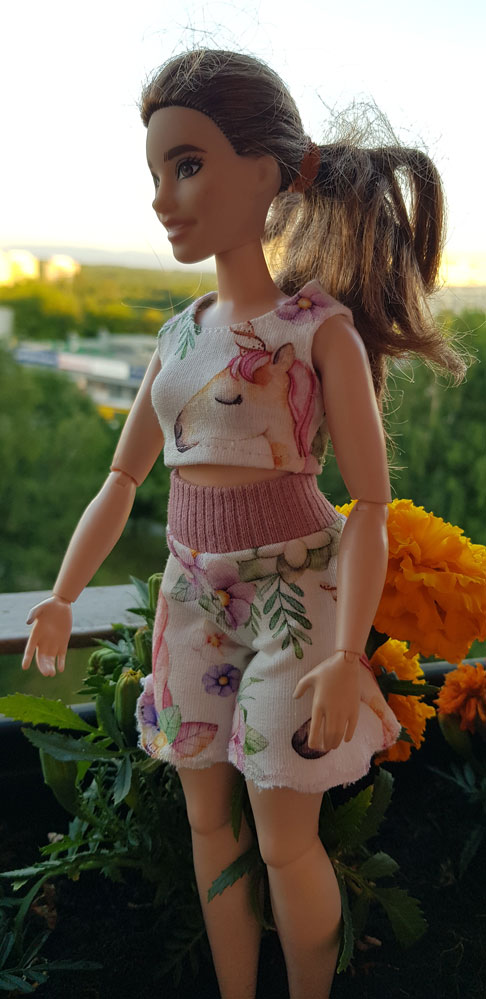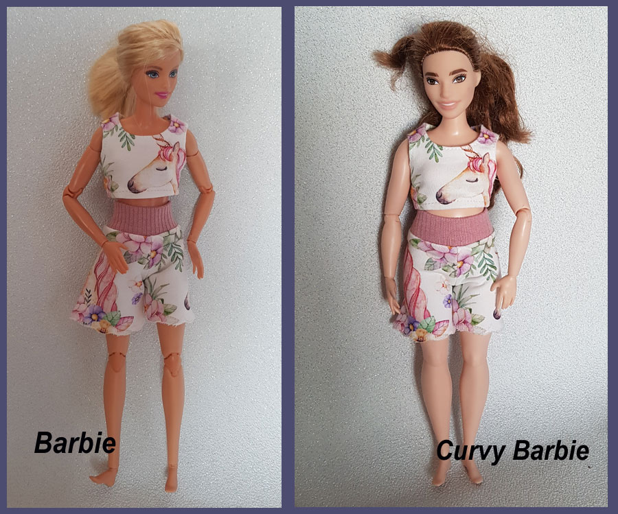 Ett set med nysydda sommarkläder till Barbie och Curvy Barbie